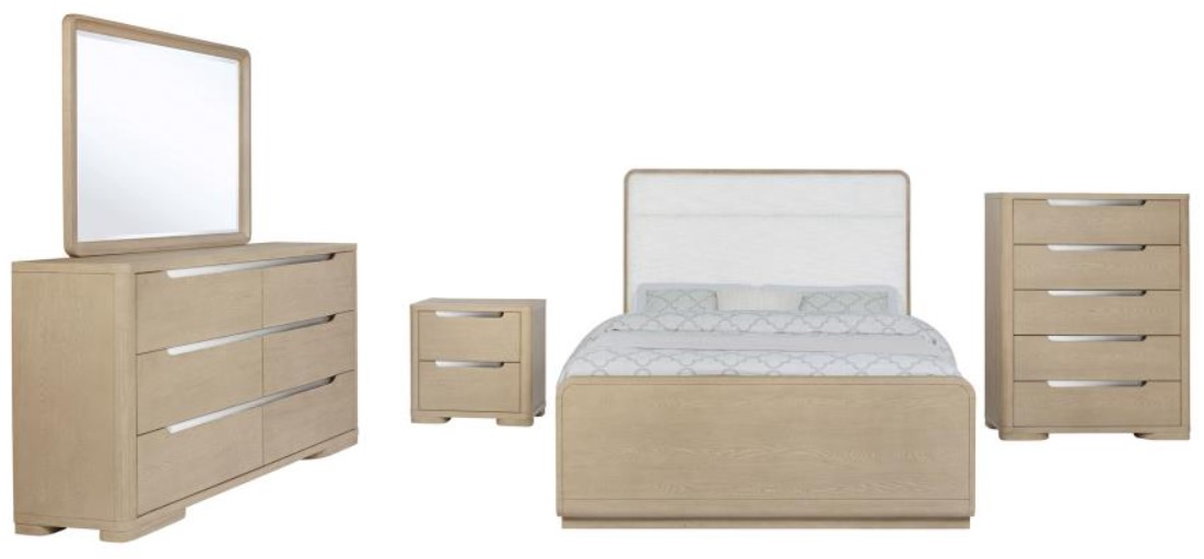 Transform your bedroom with this stunning contemporary set, crafted in a light elm finish that exudes warmth and sophistication. Rounded corners soften the sleek design, while brushed nickel accents provide a subtle touch of modern elegance. Designed for both style and functionality, this set features ample storage with premium details like tinted interiors.Read More
