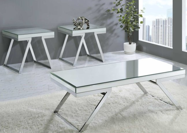The Alfresco Table Set features a glistening chrome base and a reflective beveled mirror top in a table that adds sparkle to any room. Mid-Century Modern styling gets a glam update in this stunning set of Living Room accessories. This set comes with a Coffee Table and two End Tables to set up a living area immediately with instant sparkle!Read More