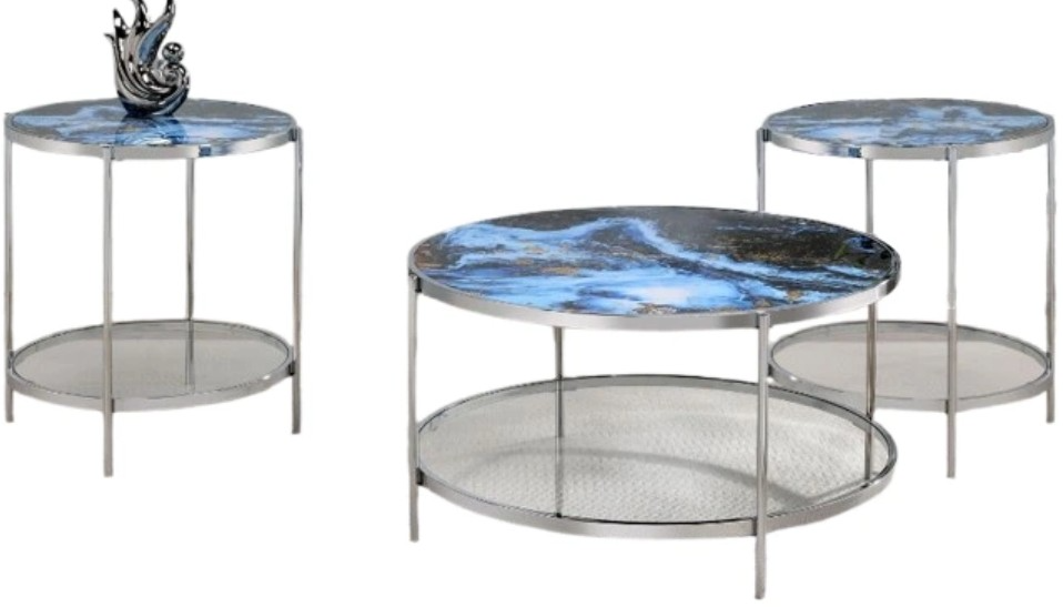 Crafted with a sleek chrome frame, these tables exude elegance with their captivating blend of blue faux marble and sparkling chrome accents. Effortlessly transform your space with this adaptable set, where style meets functionality for an unmatched experience.