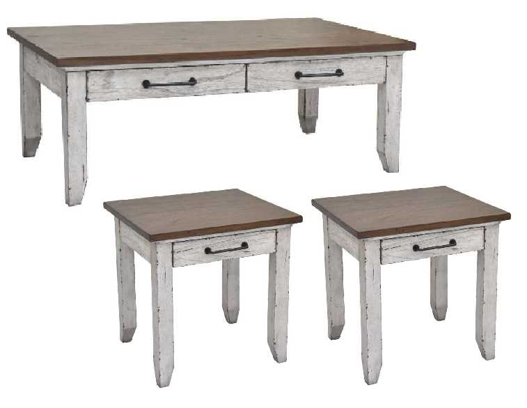 Styling details include distressed finish that gives tables a vintage heirloom feel, two-tone finish for a farmhouse look and tapered legs that give tables a modern look