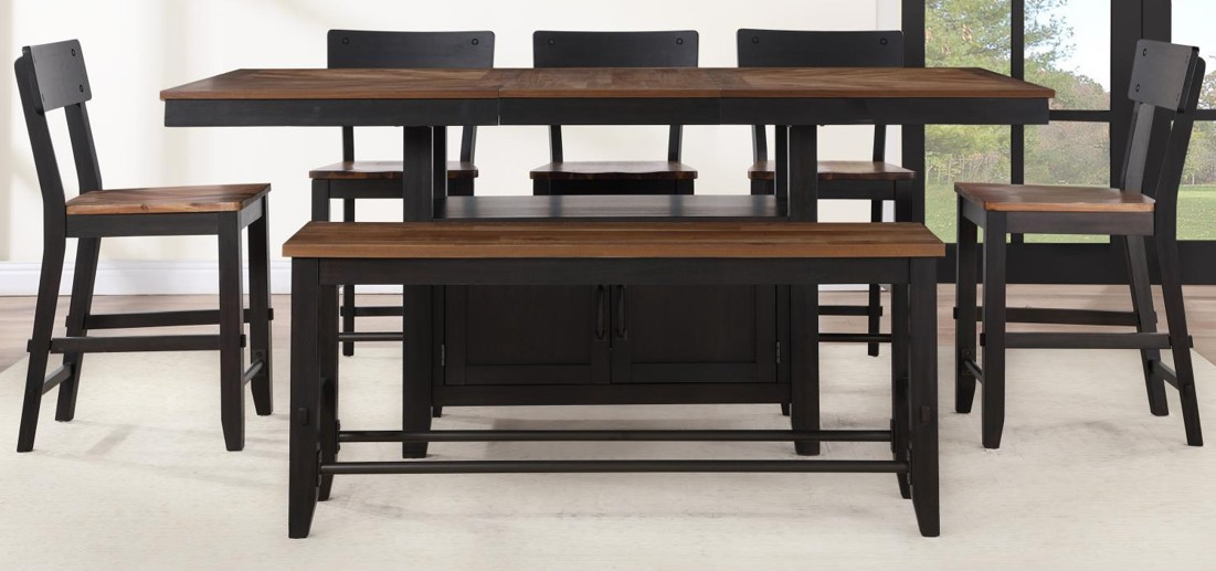Elevate your dining space with the Bermuda 7-piece counter dining set. This set includes a table and four counter chairs blending modern farmhouse style with contemporary elegance. Featuring black and dark acacia finishes the 36-inch high table is versatile for dining or working with a 20-inch leaf that expands it from 60 to 80 inches.Read More