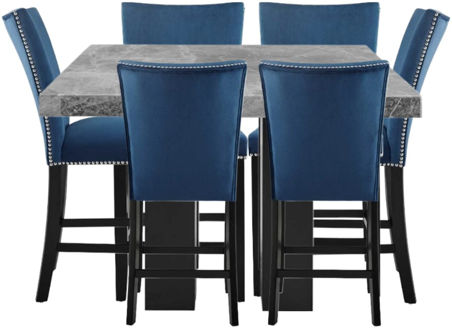 Elegant dining with a modern twist, Camila offers beautiful white marble counter dining with a choice of three counter chair options – silver or black easy-care polyurethane or an upscale blue velvet look. All chairs feature stretchers and nailhead trim to dress up any dining area.Read More