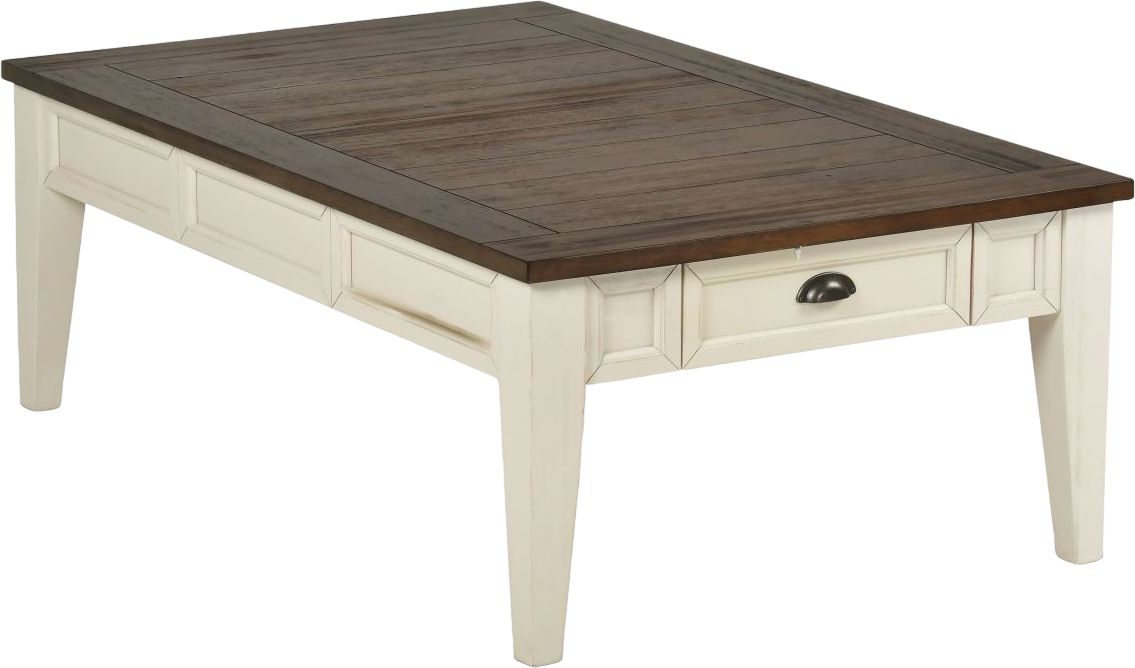 Steve Silver Company harmoniously blends elements of contemporary and cottage styling to create a modern farmhouse look with the Cayla occasional collection. The tables feature a two-tone finish of antiqued white base with dark oak top and each table features a drawer with cup drawer pull.Read More