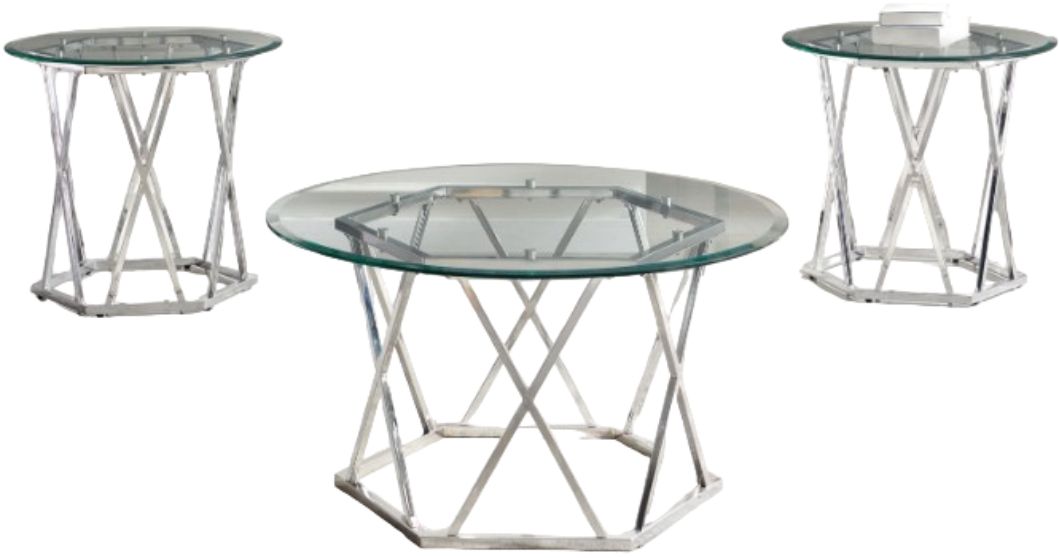 Clean lines and modern styling make the 3-piece Escondido Table set a beautiful addition to any living room. This mixed media table set features a tempered glass top that showcases a gorgeous hexagonal shaped chrome table base that add a sparkle to any room.Read More