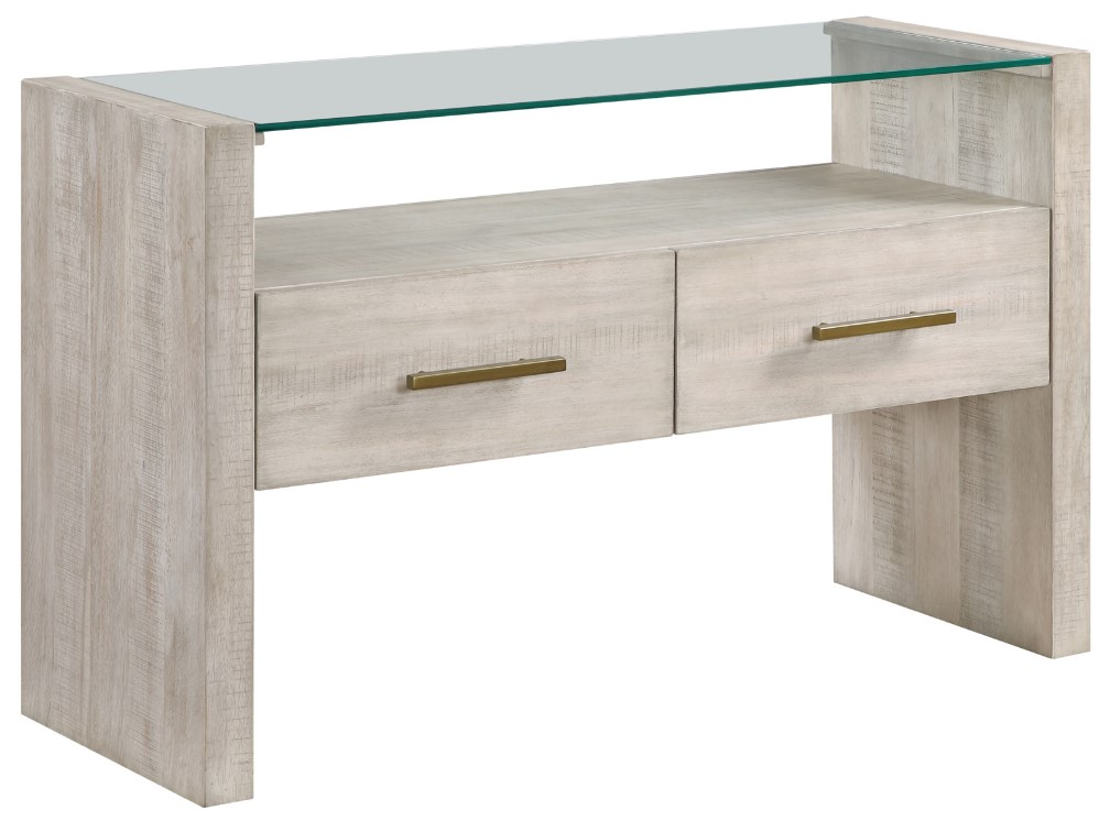 The Garland sofa table combines style and function in a compact design. Featuring a glass top and an open shelf underneath, it offers a sleek, modern look while providing practical storage with a lustrous distressed washed parchment finish.Read More