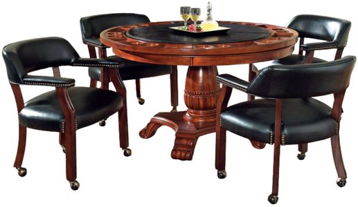 The game top folds and stores easily, and the table goes back to a dining table. The upholstered faux-leather captain’s chair has casters for easy mobility and comes in a wide range of colors, perfect for every decor.